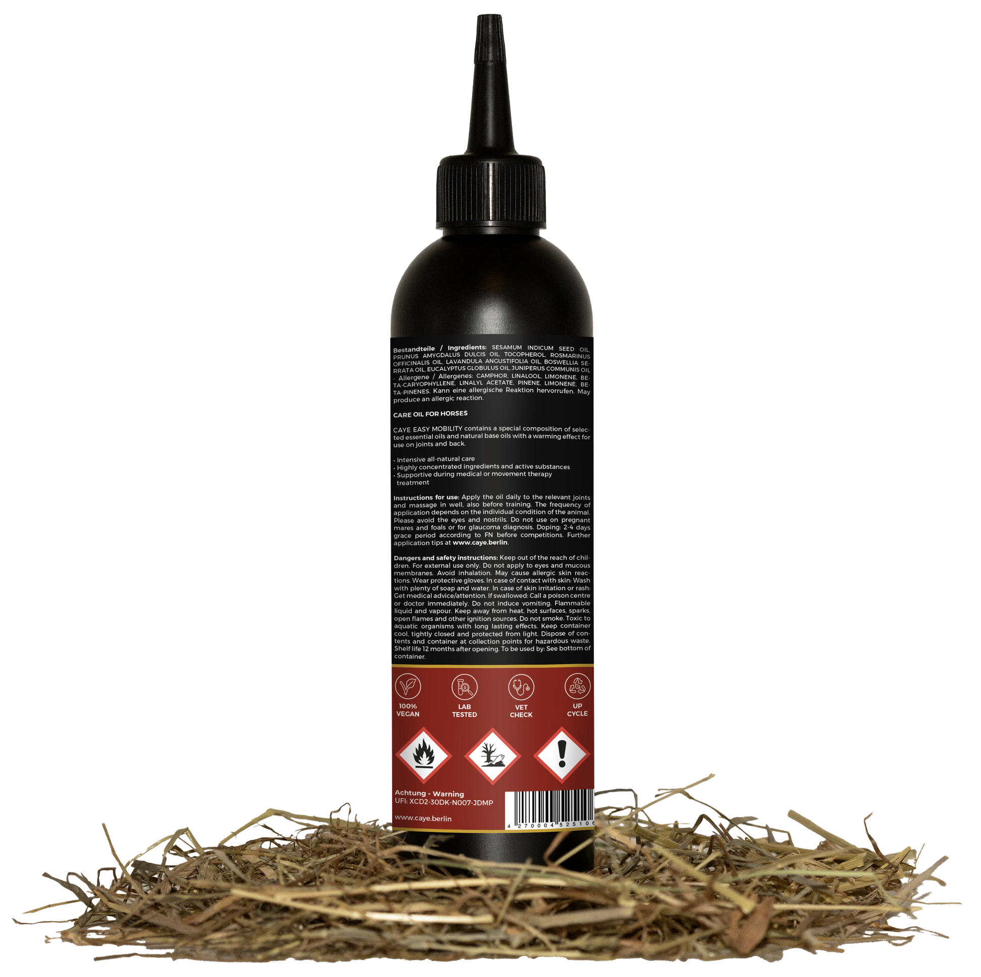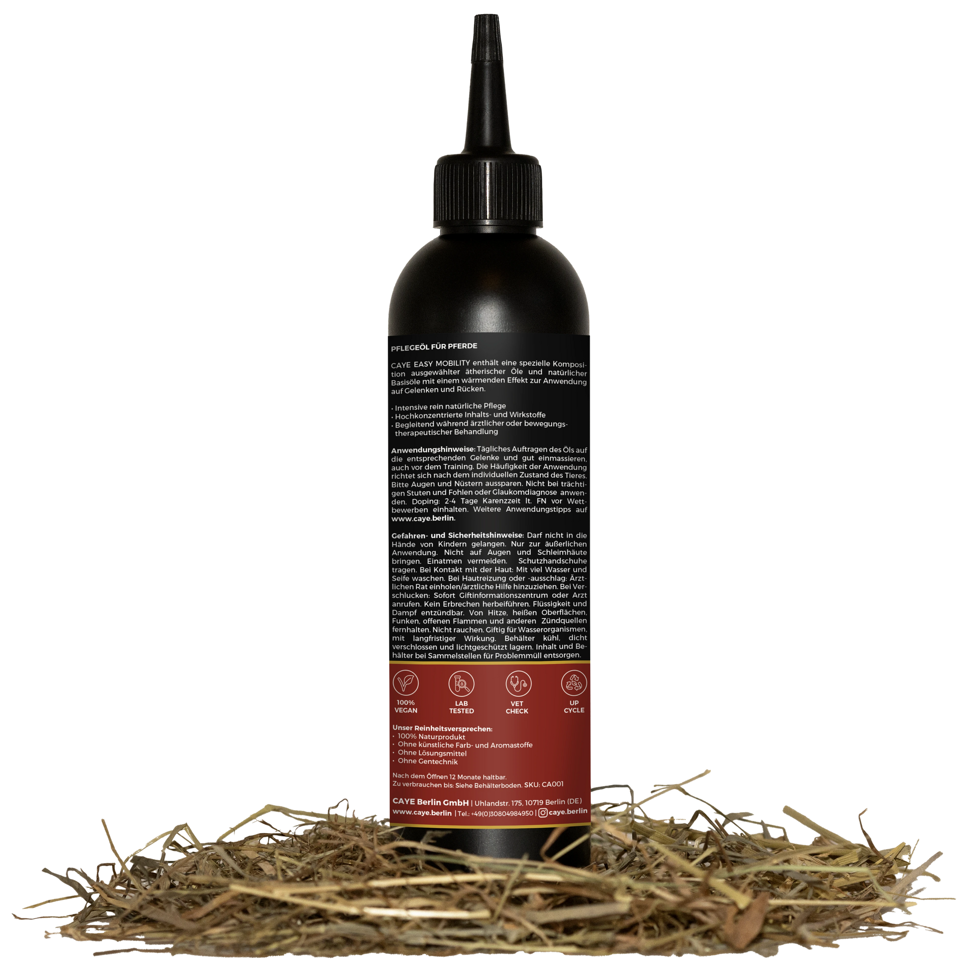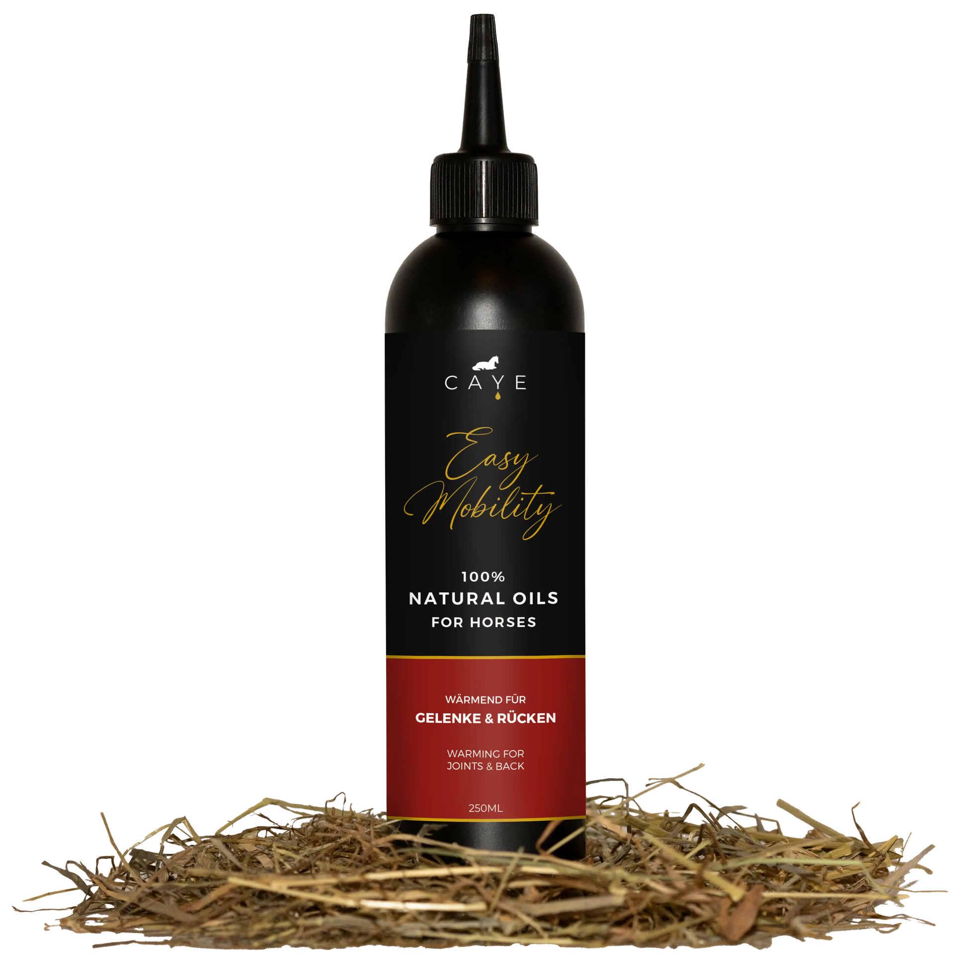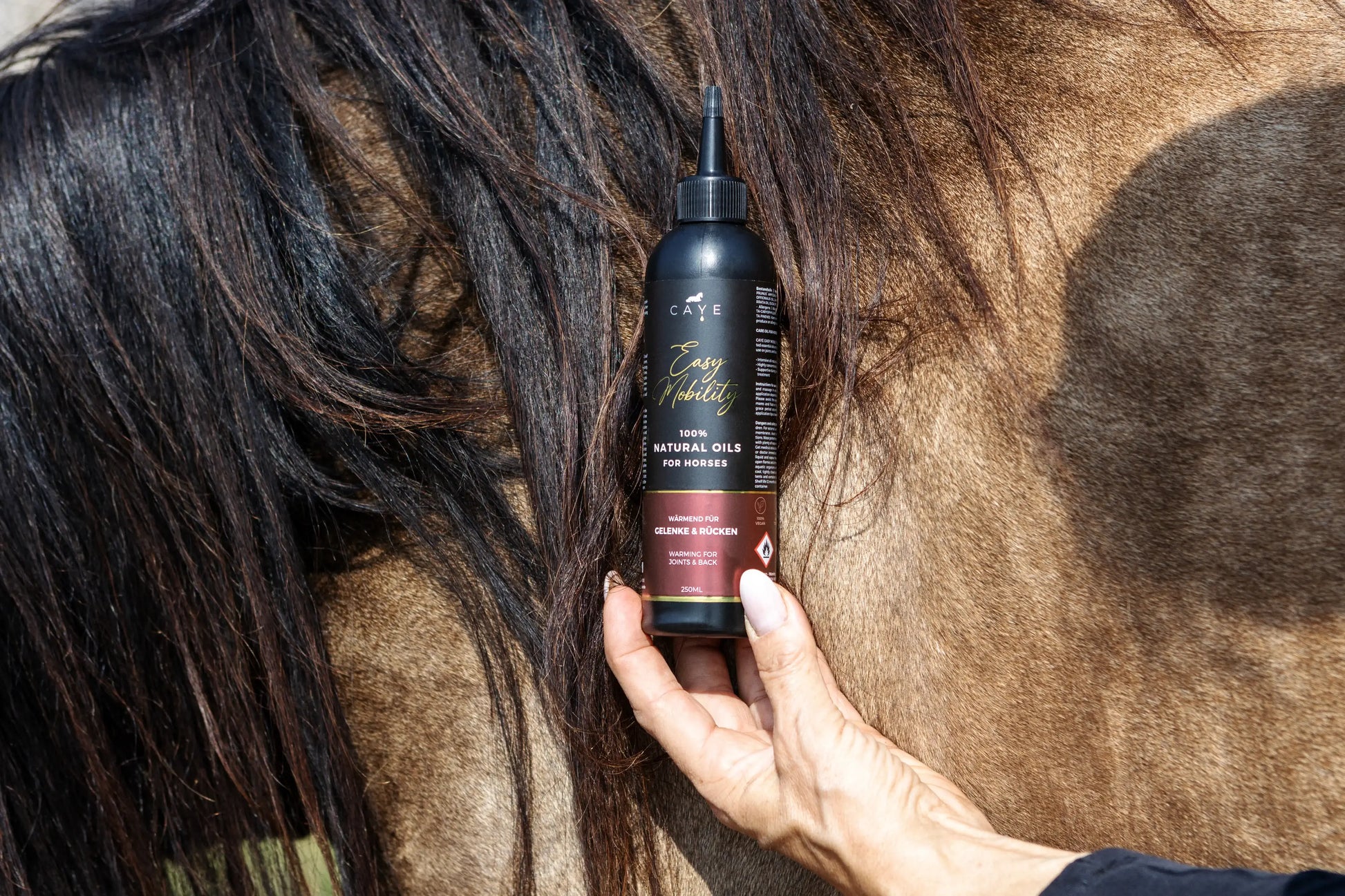 Natural care oil for horses - Our CAYE Easy Mobility contains a special composition of selected essential oils and natural base oils with a warming effect for application on joints and back.