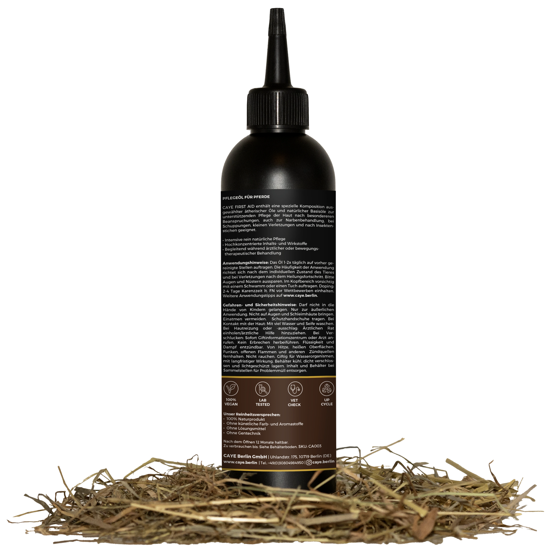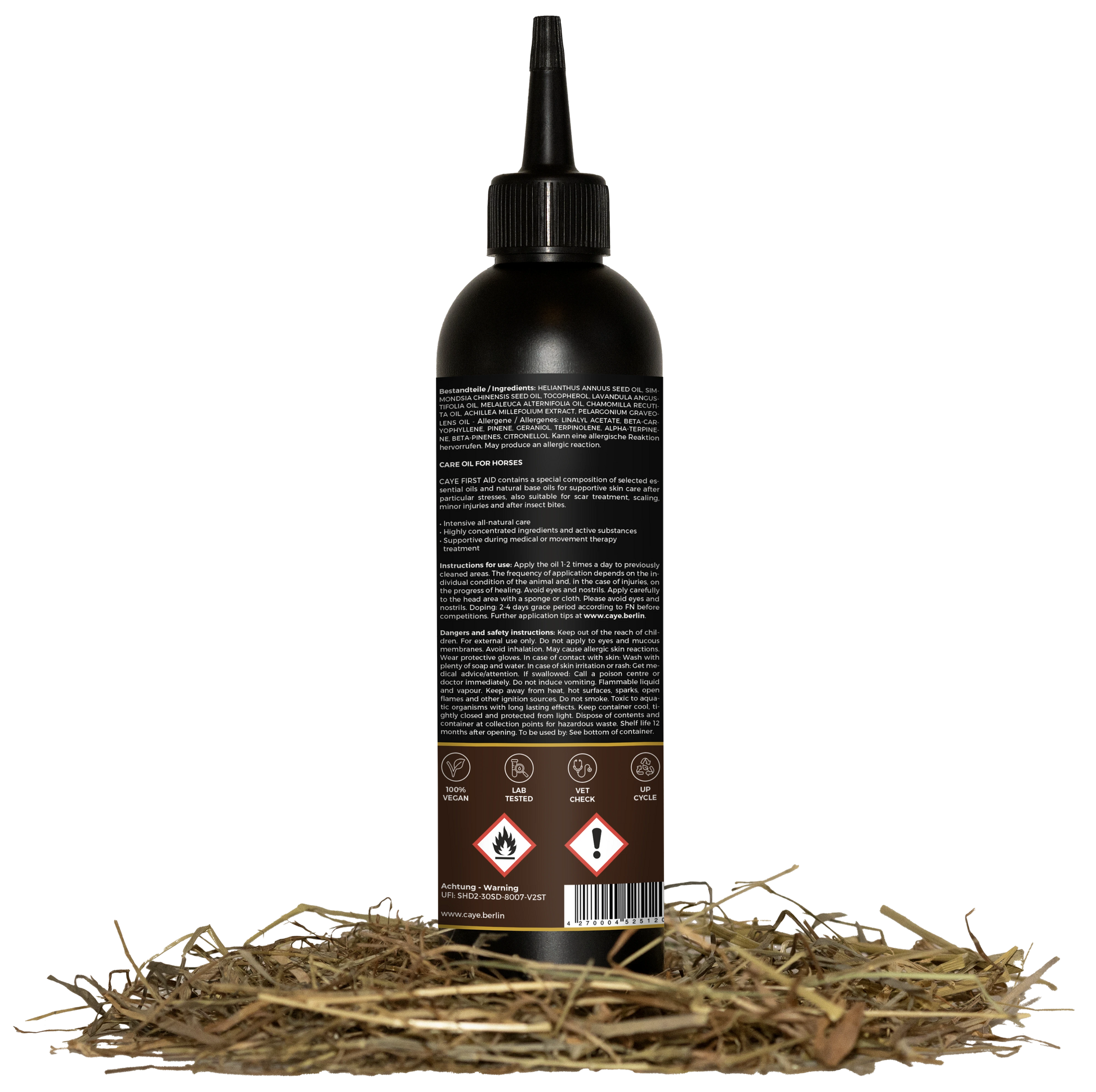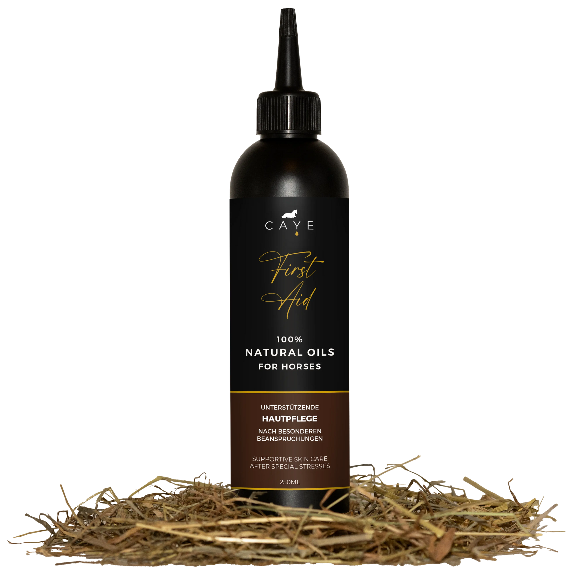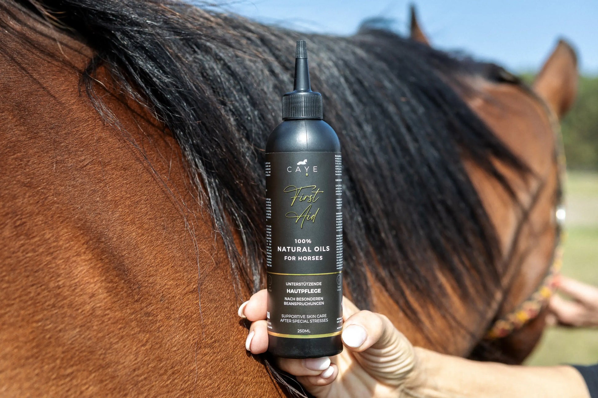 Natural care oil for horses - Our CAYE First Aid contains a special composition of selected essential oils and natural base oils to support the care of the skin after particular stresses, also suitable for scar treatment, flaking, minor injuries and after insect bites.